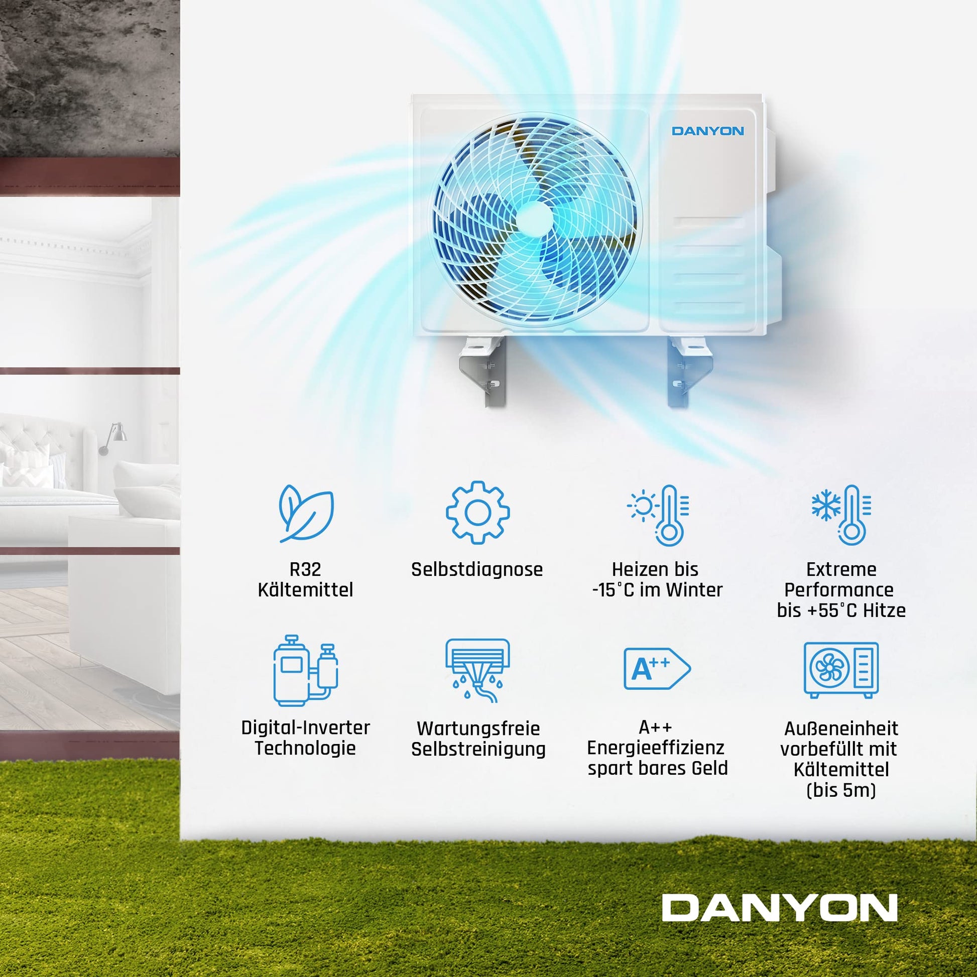 Danyon Klimaanlage Split - 12000 BTU - 3,4 kW, Selbstreinigung, leise, Smart Home, Inverter Klimagerät mit Heizfunktion